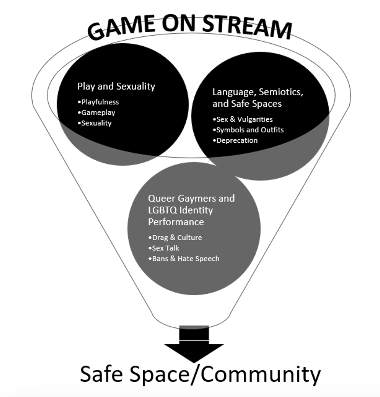 By exploring gaymers’ explorations of identity through playing games on Twitch, my observed use of social semiotics of language, utterances, symbols, and meaning making can all be related to the larger scholarship of queer gaymers and LGBTQ identity, play & sexuality, and language, semiotics, & safe spaces. I propose that these thematic topics all come together like a funnel to create a safe space and community. Present within each of these categories happen to be discussions of sex, sexuality and raunchiness. It is not simply that community is emergent from these topics, but rather it is a continuous reading of how community emerges when streamers and viewers are collected in a space with similar interests and identities.