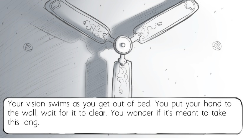 struggles not just with eating but also with watching their partner eat. In scenes like this, SP strategically utilizes the semantic register of the body and the senses, relating to the smell and texture of meat, which are perceived as revolting and nauseating, or the feeling of their own body perceived as an absurd object: “the feel of the fat of your thighs pressing together when you sit down, the fold where your stomach meets your legs.” The anorectic experience’s controlling, objectifying self-reference is echoed in the stream-of-consciousness through almost clinical language, with terms like “vertebrae” and “collarbone.” As the bodily/mental well-being of the main character deteriorates, the game offers these bodily sensations as situated knowledges (Haraway, 1988) to the player, who is confronted with an attentive and small-scale phenomenology of the anorectic body, its drives and affective reactions towards the world (fig. 3). In situated perceptions and reflections upon them -- such as when the player-character watches the ceiling and realizes how their perception has changed because of malnutrition -- the player is directly approached by this phenomenology, which suggests itself as an intimate and honest reflection of experience.