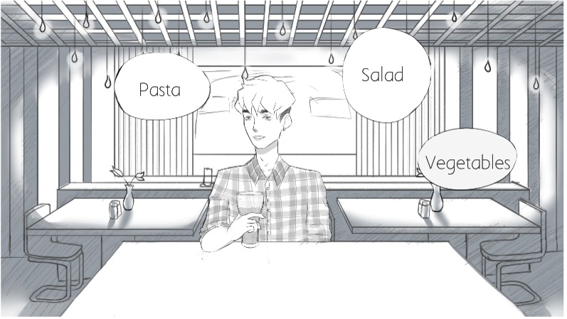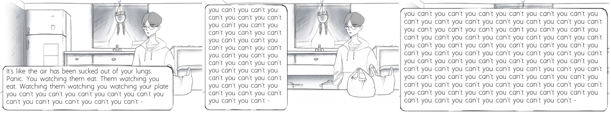 With a total playtime of about 15 to 20 minutes, Shrinking Pains (SP) is a short, free, autobiographical and narrative-driven game that explores experiences of living and struggling with anorexia. The game’s visual novel approach aims to depict anorexia through a composite spatiality resembling point-of-view shots (fig. 2). The images presented are tied to the (first person) perspective of the main character, who thus remains invisible but indirectly focalizes all layers of the narrative, from sound effects to moments of close-up style impressions [5]. As in the graphic novel medium, the surrounding physical world is combined with speech and thought bubbles, relating everyday conversations and the thoughts of the protagonist. The game explicitly identifies the unnamed protagonist with the (implied) player: the many speech bubbles directly frame the protagonist’s thoughts as the player’s, addressing her in the second person singular. The title varies the gender of the protagonist’s partner according to player preference to further push this coupling between player and character.