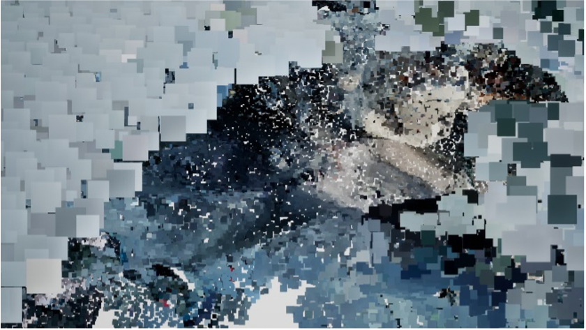 The game’s two expressive channels (fragmented visuality and documentative sound) are combined in the processual and embodied interaction with the player. Though the player may find her body engaged in navigation, perception and movement, in a way resembling the (more telic) genre of the guided walking tour, she is also able to playfully relate to the game through these activities. While playing the title, one may notice a contrast between intimate attention to the scripted visual-auditory narrative and playful probing of the limits and features of the game as a space of possibility. Meddling with the fragmented frame of the car at the beginning of the walk, for instance, may turn into the creative act of exploring novel sights/sites of play with the game’s materiality. For example, when I recursively position and rotate the camera perspective within the interior of the car during my own playthrough, I become fascinated by the emerging constellations of color patches, which evoke the genesis of new (pixel) universes (fig. 7).