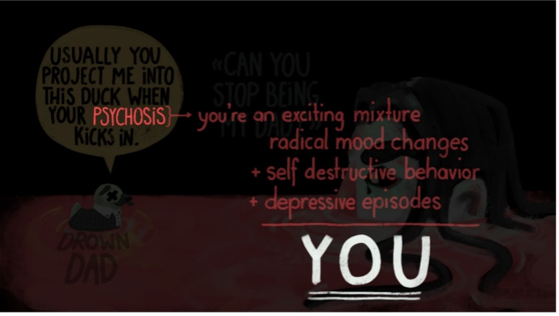 The game communicates to the player that the player-character is living with particular mental conditions. In a particularly striking moment, Ophelia speaks to her rubber duck, which suddenly turns into her father. Here, the game draws a direct link between what is happening, the term “psychosis,” and the player-character (fig. 9). This explicit reference to clinical discourse is combined with affective color, language and images that involve the player in a surreal phenomenology of Ophelia’s experiences. Frequent sensory-related language affords the embodiment and identification of the player: when the player-character drinks from her glass, they feel how “desperation rushes through every fiber of you. Something freezing covers the inside of your ribcage.” The game’s sound design accentuates its visual elements, adding details like a pouring sound of water when a new game is started or gulping sounds indicating when the player-character is drinking. Additionally, subjective ambient sounds affect the mood of play, such as in one situation when fear and danger are signaled by a menacing buzzing that escalates into the shrieking sounds of a distorted guitar.