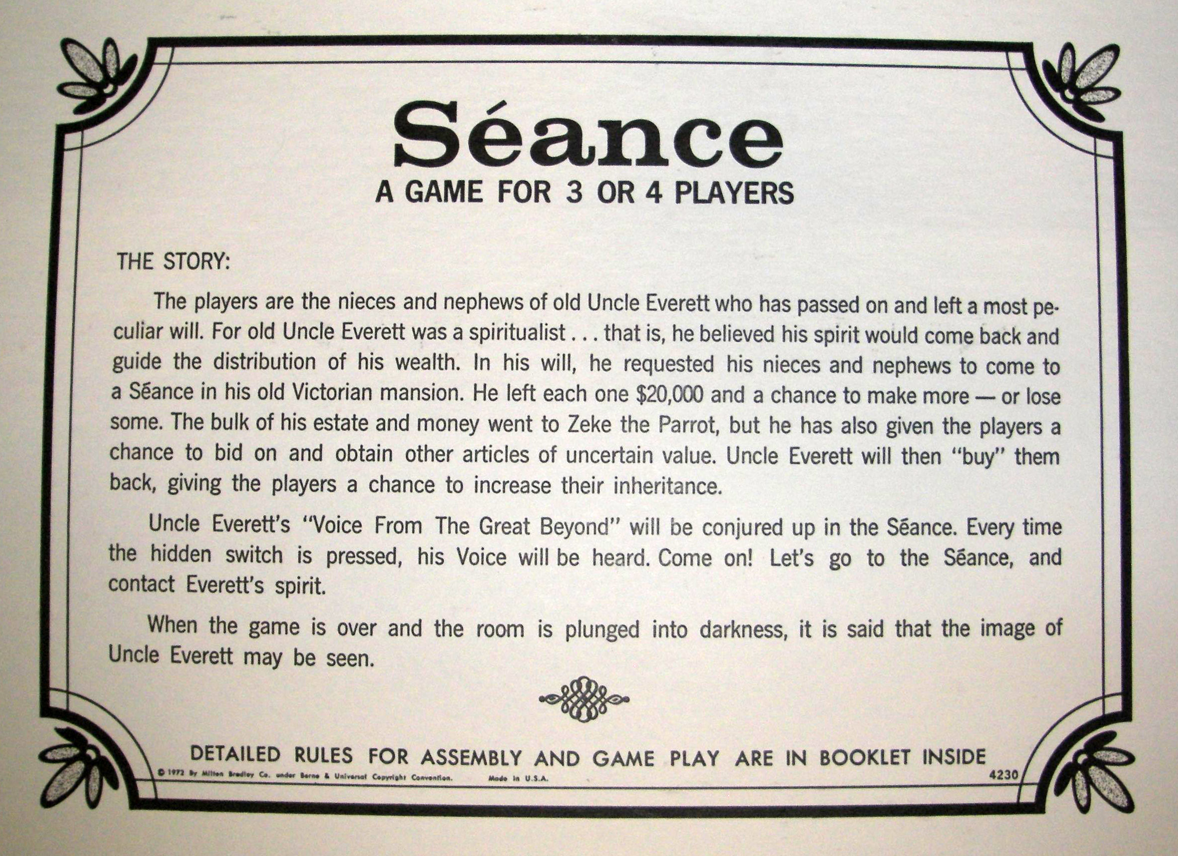 Milton Bradley (1972). Séance. Board game with an uncredited designer published by Milton Bradley.