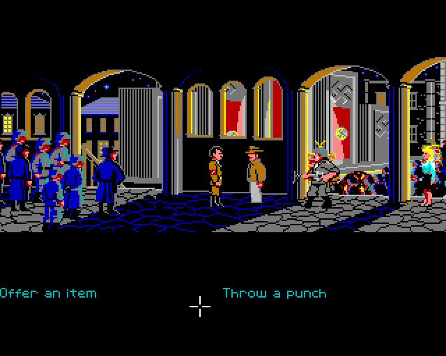 Figure 2: Indiana Jones meets the Führer in a memorable scene in Indiana Jones and the Last Crusade (Lucasfilm Games, 1989). Should the player decide to punch Hitler, Jones will be killed by the Nazi soldier standing behind him with a gun. Click image to enlarge.